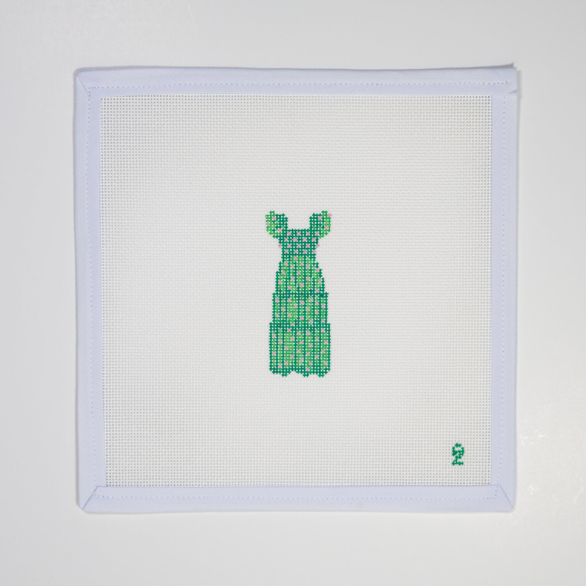 Canvas is 18 mesh, hand stitch painted Dress is 3x1.5 inches